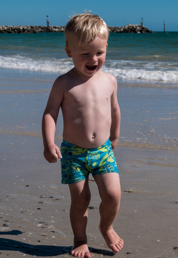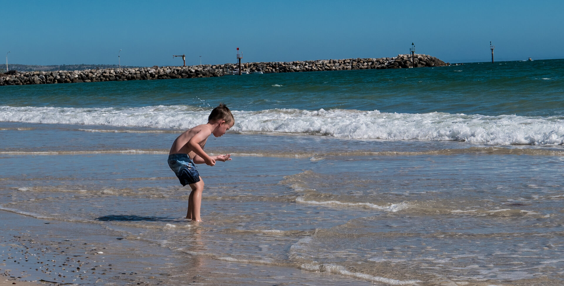 Vi pakkede vores ting. Drengene var henrykte over vores nye camper, som de synes var mega sej, og vi tog hen på en rigtig god campingplads, som vi havde booket på forhånd – rigtig stor campingplads med gåafstand til vandet og med pool og waterpark. Vi fik os installeret, Viggo fik en lur, og Adam og jeg tjekkede stedet ud. Der var alt muligt at lave i dette børnemekka – men af en eller anden grund, så gider vores børn ikke rigtigt at lege, hvis der er alt for mange andre børn – især ikke hvis de andre børn er store og voldsomme, og dem var der en del af. Vi tog ned til stranden, hvor der var mere ro – og det var lige noget for os – skøn og lækker strand – meget børnevenlig – helt fint strandsand.