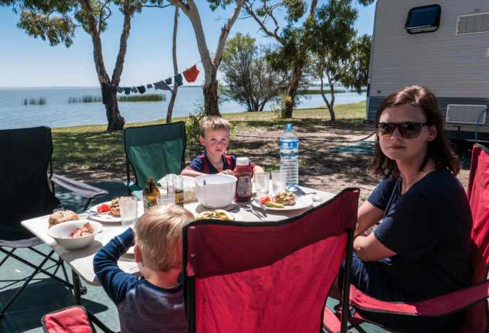 ”Tror du, vi kommer til at hygge os i den her camper”? Sætningen faldt da Jonas og jeg sad og kiggede ud over havet og den smukke solnedgang, hvor drengene legede med vandet. Selvom vi godt vidste at vores camper i Australien var mindre end den i New Zealand, så var det noget af en mavepuster at se de faktiske forhold. Det blev pludselig tydeligt, at vores camperliv i New Zealand har været ren luksus. Vores nye (meget gamle og slidte camper) er lille og uden toilet (og ja ja – det vidste vi godt – det handler jo om økonomi og prioritering, men vi skulle godt nok lige synke et par gange, da det sådan rigtigt gik op for os). Der er stort set ingen opbevaringsplads, som ikke er under hynderne, hvor man skal hive plader op for at komme ned til sine ting, og jeg tænkte straks på, hvor besværligt, det hele ville blive, med alt det, man konstant har brug for at have lige ved hånden med små børn.