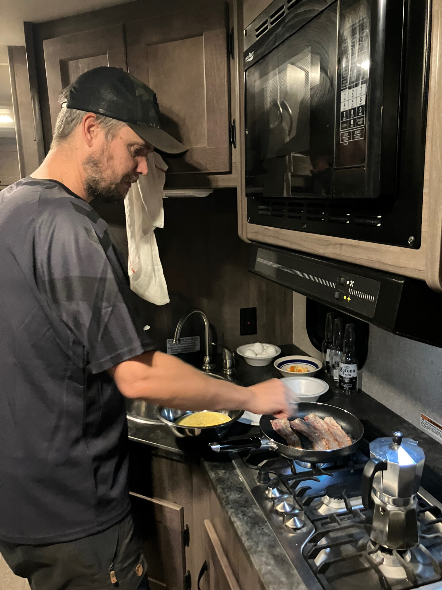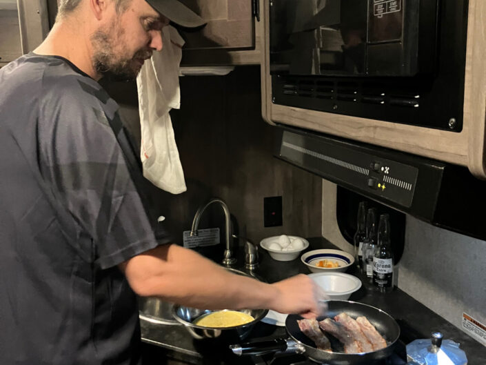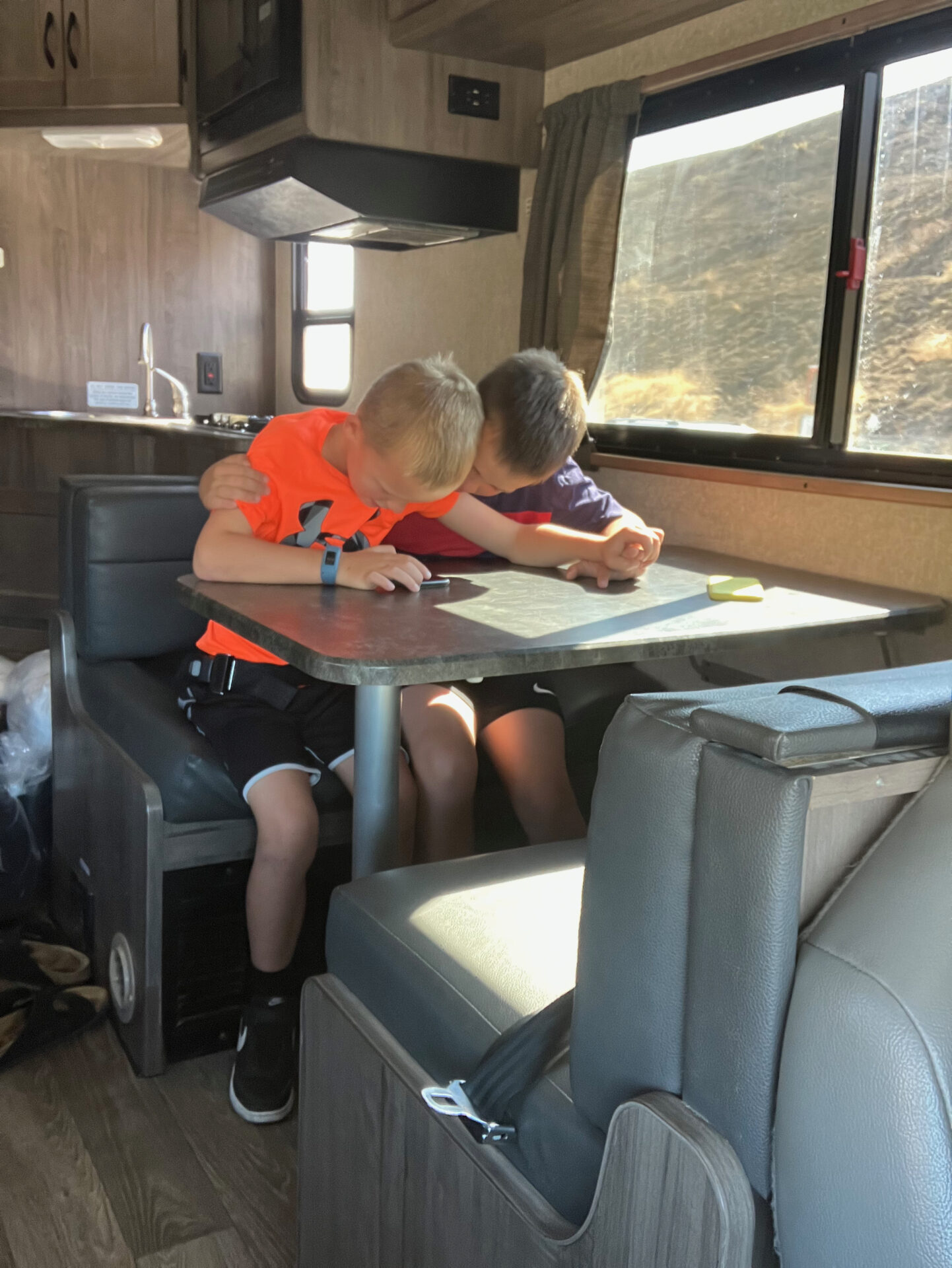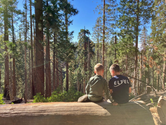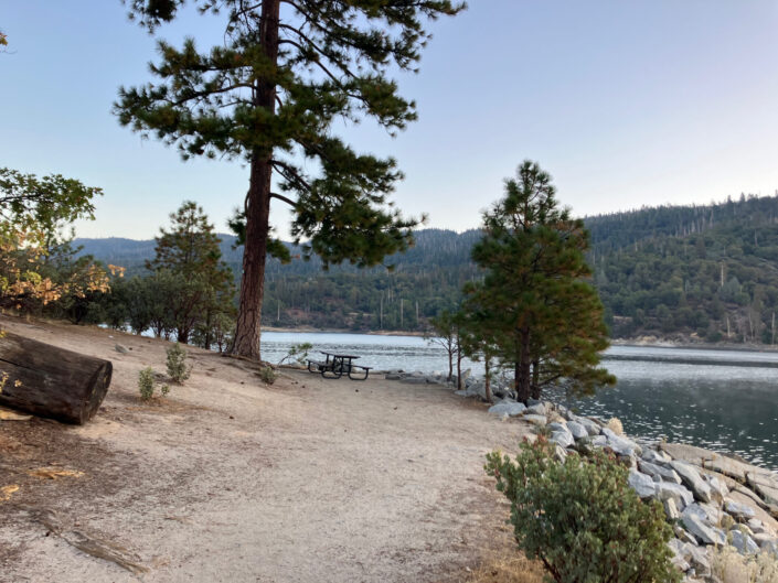 Vi hentede vores camper, en kæmpe men gammel 7 personers RV med god plads til os fire. Vi stak mod nord i retning af Yosemite. Vi fandt en parkeringsplads ved Bass Lake, hvor vi parkerede for natten, og da vi vågnede næste morgen viste det sig at være lidt af et paradis. Helt blik stille, koldt og roligt. Adam og Viggo var ikke sønderligt interesserede i at opleve den smukke natur – de ville hellere game i camperen (?!) men vi voksne gik en lille tur og snuste den friske bjergluft ind. Morgenmaden stod på æg, bacon og toasted brød, og så var vi ligesom i gang.