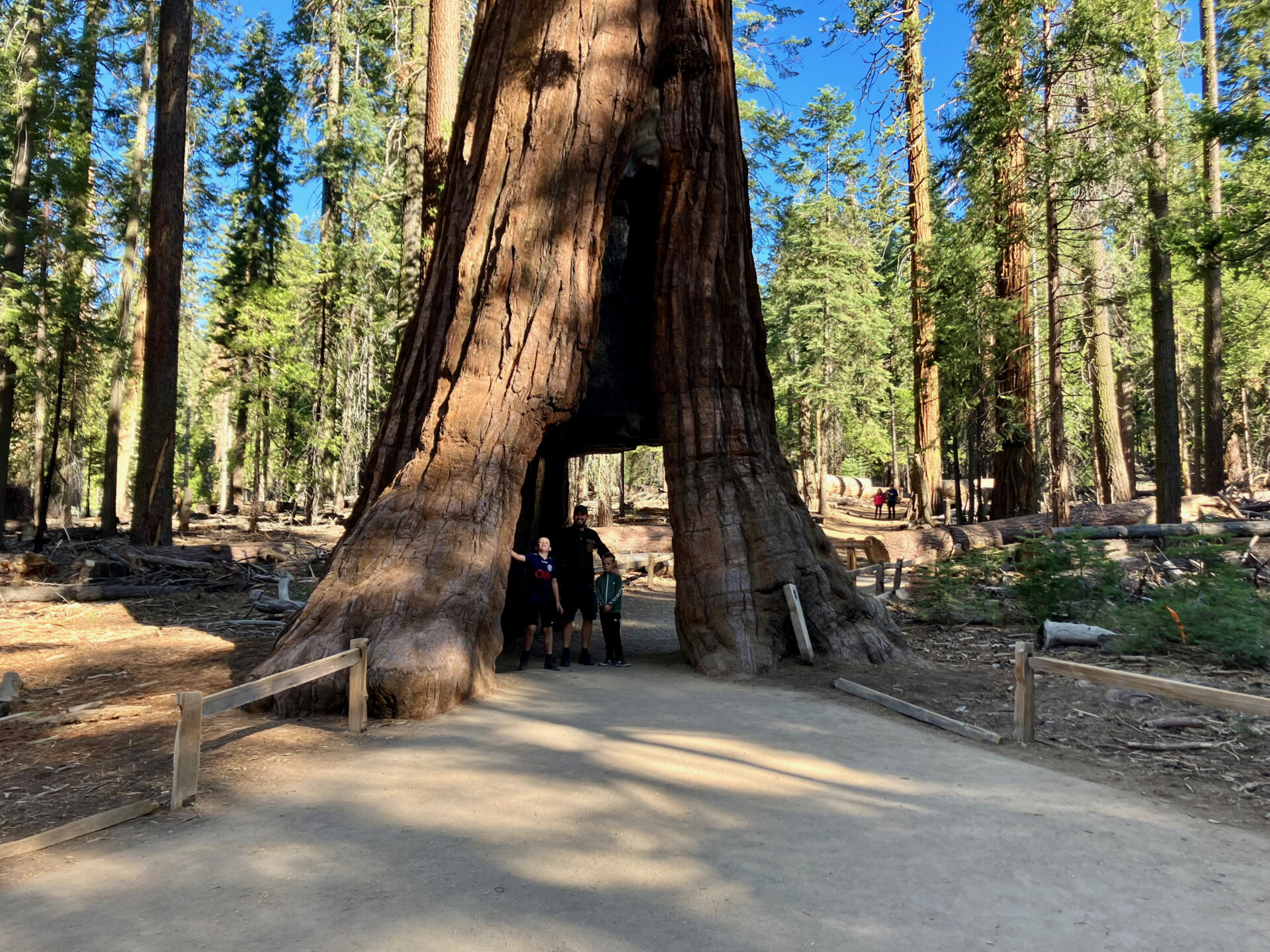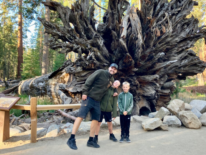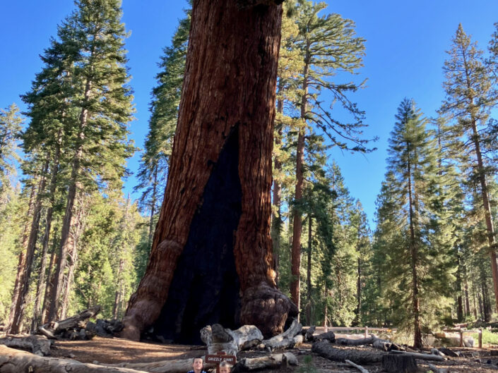 Vi fortsatte mod Yosemite. Enkelte gange måtte vi tage en anden rute end Google Maps foreslog, for vejene er virkeligt ikke særligt gode, og med en bred, lang og tung bil føltes det lidt for spændende af og til. Vi kørte op til Mariposa Grove, hvor nogle af verdens største Sequoia træer er. Parken var fint anlagt med masser af forskellige ruter, man kunne gå. Vi gik efter en rute med det berømte ”Tunnel tree”, hvor der er lavet en åbning igennem et af de kæmpe Sequoia’er. Vi var for det meste alene ude i den kæmpe skov – altså bortset fra de hundredevis af egern – og det gav den dejligste følelse af at være på road trip og på opdagelse i ukendt land.