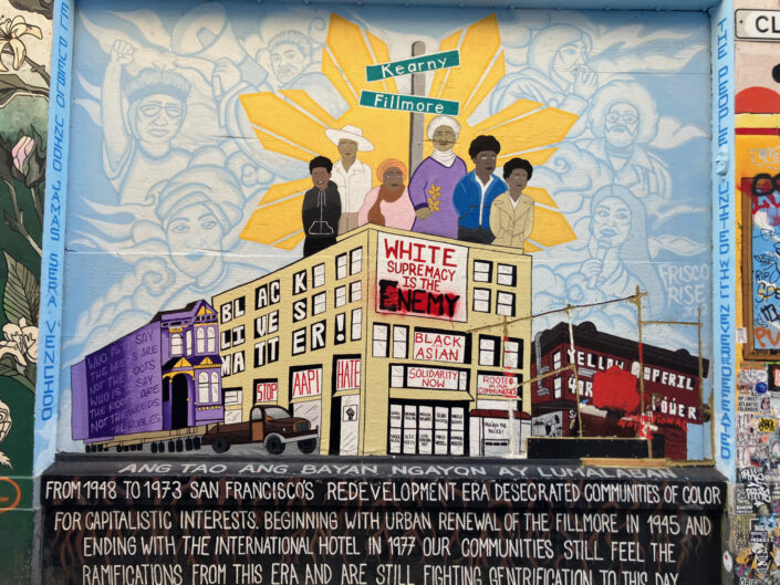 Jeg havde fået området anbefalet af en tidligere kollega, som har boet i San Francisco. Kvarteret skulle være sådan lidt a’la Nørrebro i København; hipster på den rå måde. Det var imidlertid mere råt end det var hipster. Der var hjemløse overalt, en stank af tis i gaderne, psykisk syge mennesker, som henvendte til os med underlige og uforstående sætninger, fok der tiggede efter en dollar til morgenmad. Måske vores indtryk af Mission District var værre fordi det var tidligt om morgenen og de fleste butikker/cafeer var gemt bag gittersikringen. Vi gik igennem Clarion Street med væg-malerierne. Malerierne var rå og udtrykte underklassen og ungdommens frustrationer over elitens måde at regere landet/byen på: De stigende huspriser, den utilstrækkelige indsats over for de store problemer omkring klima, racisme, stigende boligpriser, hjemløshed, inflation. Forarmelsen er til at tage og føle på i dette kvarter; og den underliggende følelse af, at USA er på vej mod et eller andet kollaps ligger og lurer. Vi oplever helt på egen krop, hvordan det er dyrt at være i USA, og det er første gang vi rigtigt oplever dette i de forskellige lande vi har rejst i. Spørgsmålet som ligger og lurer nedenunder er: Hvis det er så dyrt for os at opholde i det her land – hvordan skal de mange lavtlønnede amerikanere så klare det i fremtiden? Det er dyrt at spise sundt. Det billigste er uden tvivl fastfood. Sådan har det været længe, men nu er det måske ved at være så dyrt at spise nogenlunde sund mad, at mennesker i USA som i forvejen har en usund livsstil i fremtiden ikke har råd til andet end at fortsætte en stadig mere usund livsstil.