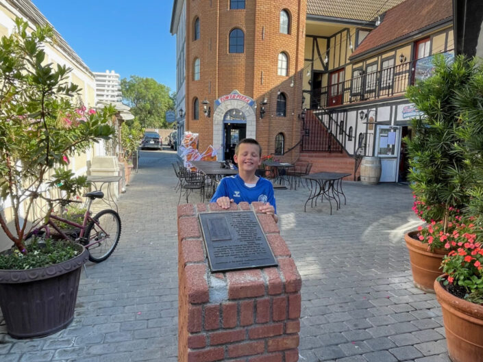 Vi fløj med Lufthansa fra Billund til Frankfurt og videre til LA. Her hoplevede vi den til dato mest luksuriøse modtagelse. Claus hentede os i lufthavnen og kørte os (i sin kæmpe bil) hen til deres hus i det nordlige LA. Her fejrede vi Anna Lucias 8-års fødselsdag.