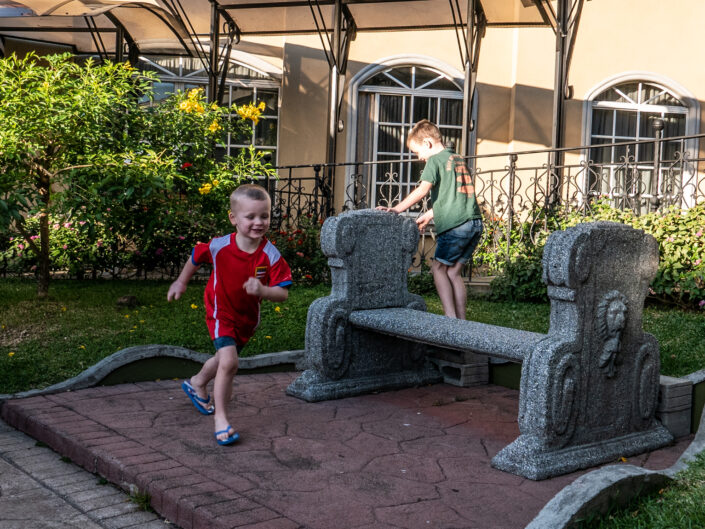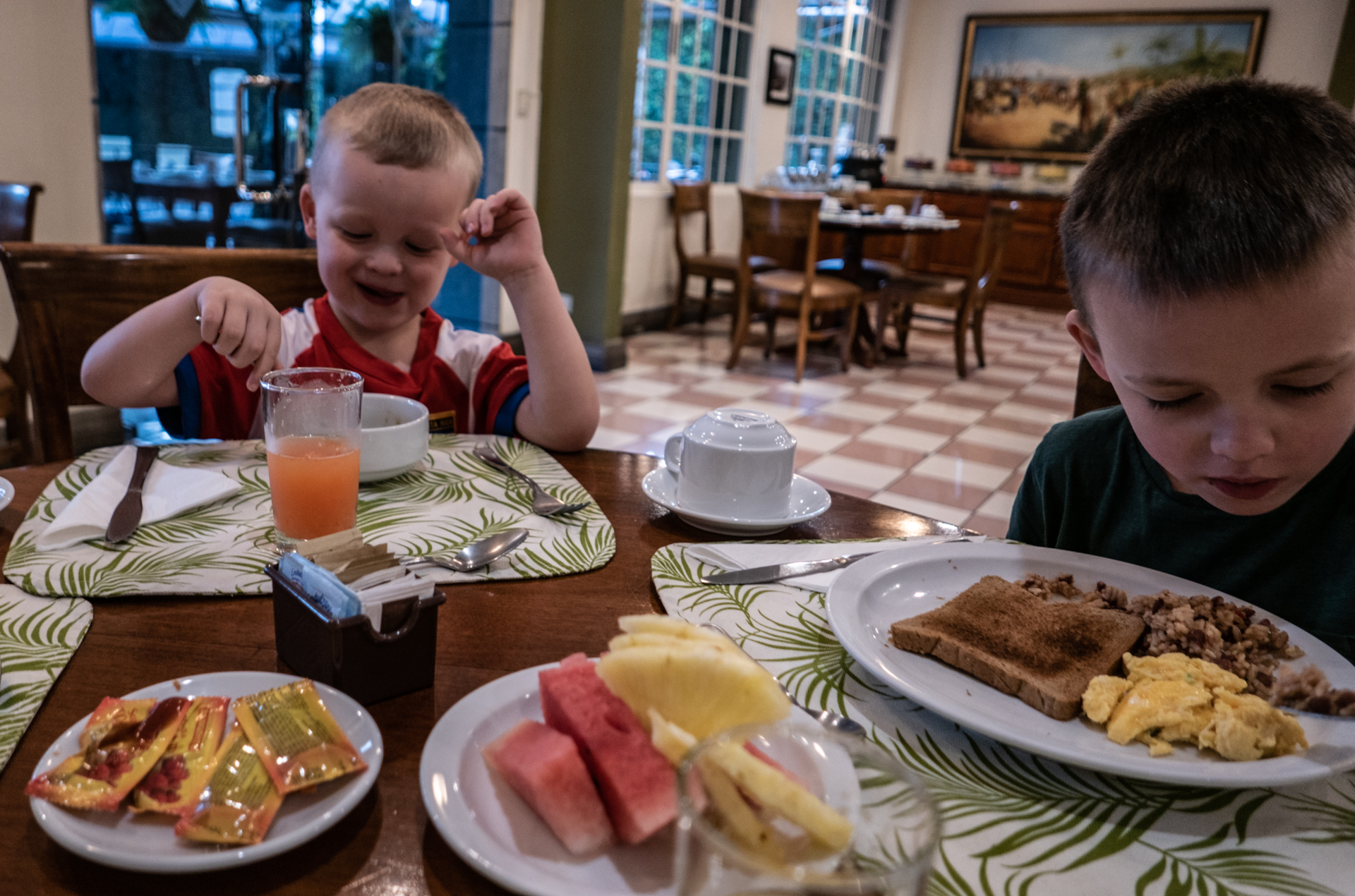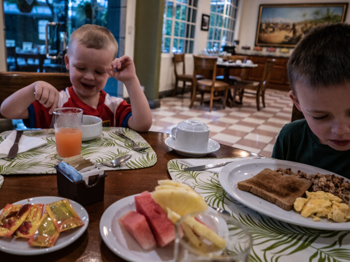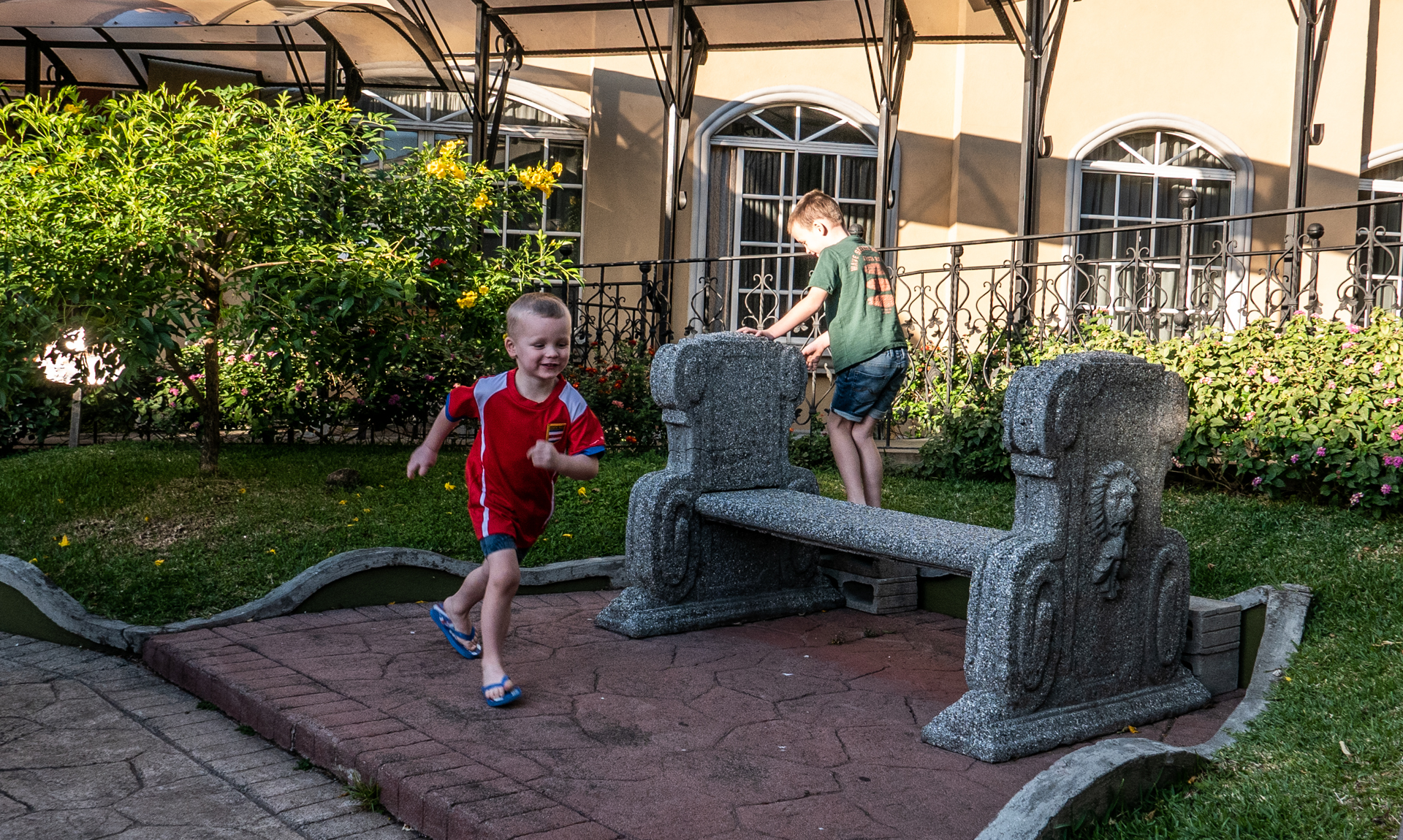 Ellers har vi brugt de første dage på at slappe af og komme over jetlaggen. Vi har boet på et dejligt hotel og nydt varmen og de mange indtryk af fremmed kultur. Dagene er gået med småture til San Jose. Vi havde ikke været i der i 15 minutter før Jonas havde købt billige Costa Rica fodbold t-shirts til drengene. Vi har også være på ”Museo de los Ninos” – børnemuseet, som var en lidt fesen oplevelse. Børnene er vist næsten allerede for store til den slags, men der var ”japansk festival” på børnemuseet hvilket betød (HØJT!) trommespil og japansk dans i rundkreds. Derudover kunne man få japanske vafler (formet som fisk) med tre slags fyld (marmelade, creme og ost) – det hele smagte ganske frygteligt hvis man spørger mig, men drengene kørte det ned med stor begejstring. Jonas lod sig gribe af stemningen og købte en japansk hotdog. Hovedrystende kiggede jeg på, og måtte konstatere, at jeg må finde lidt mere ja-hat frem hvad angår mad.