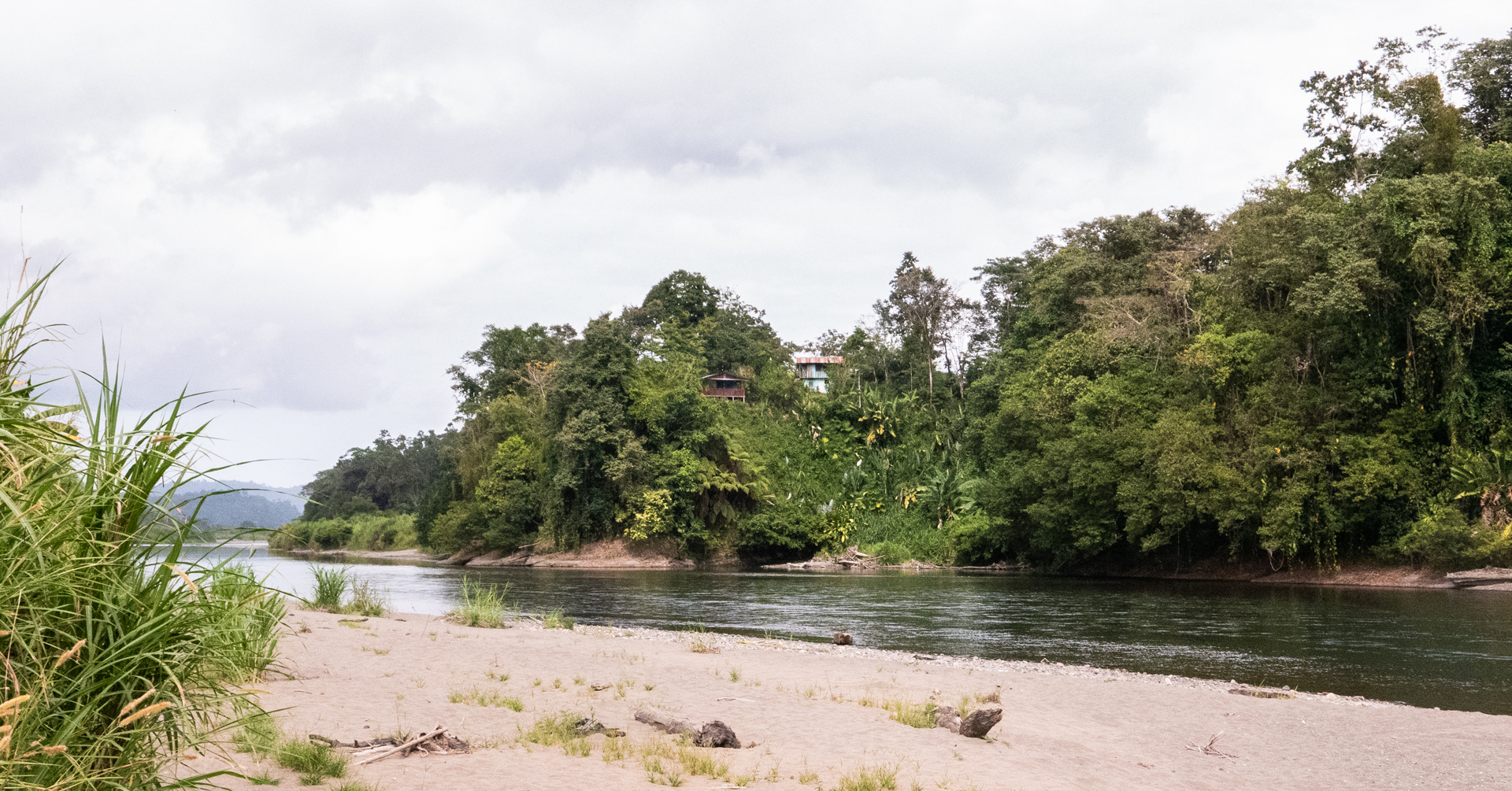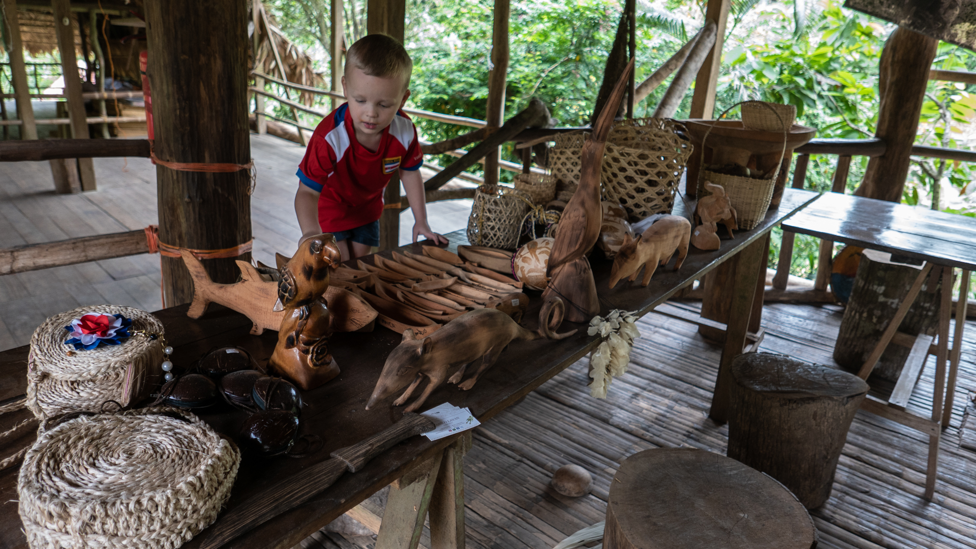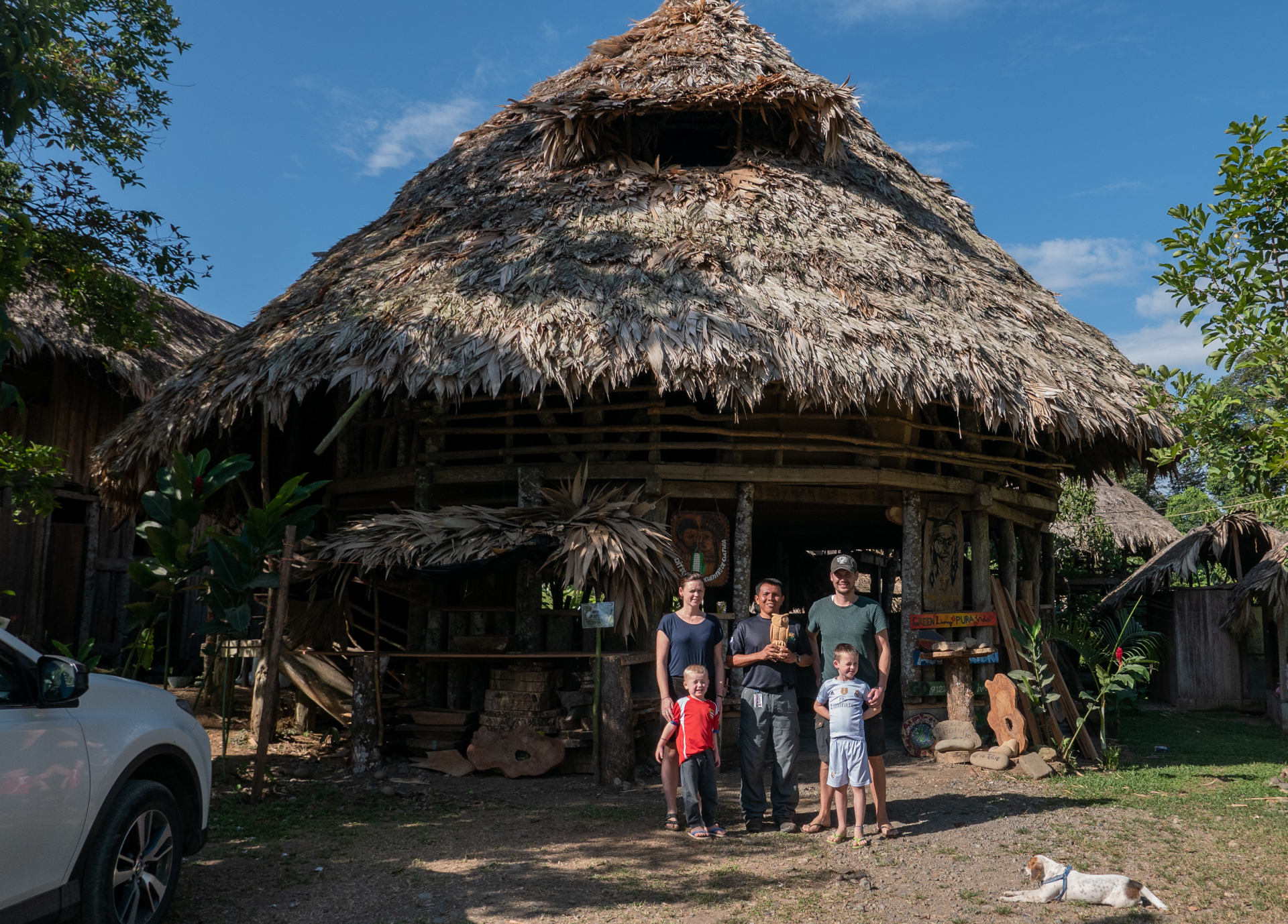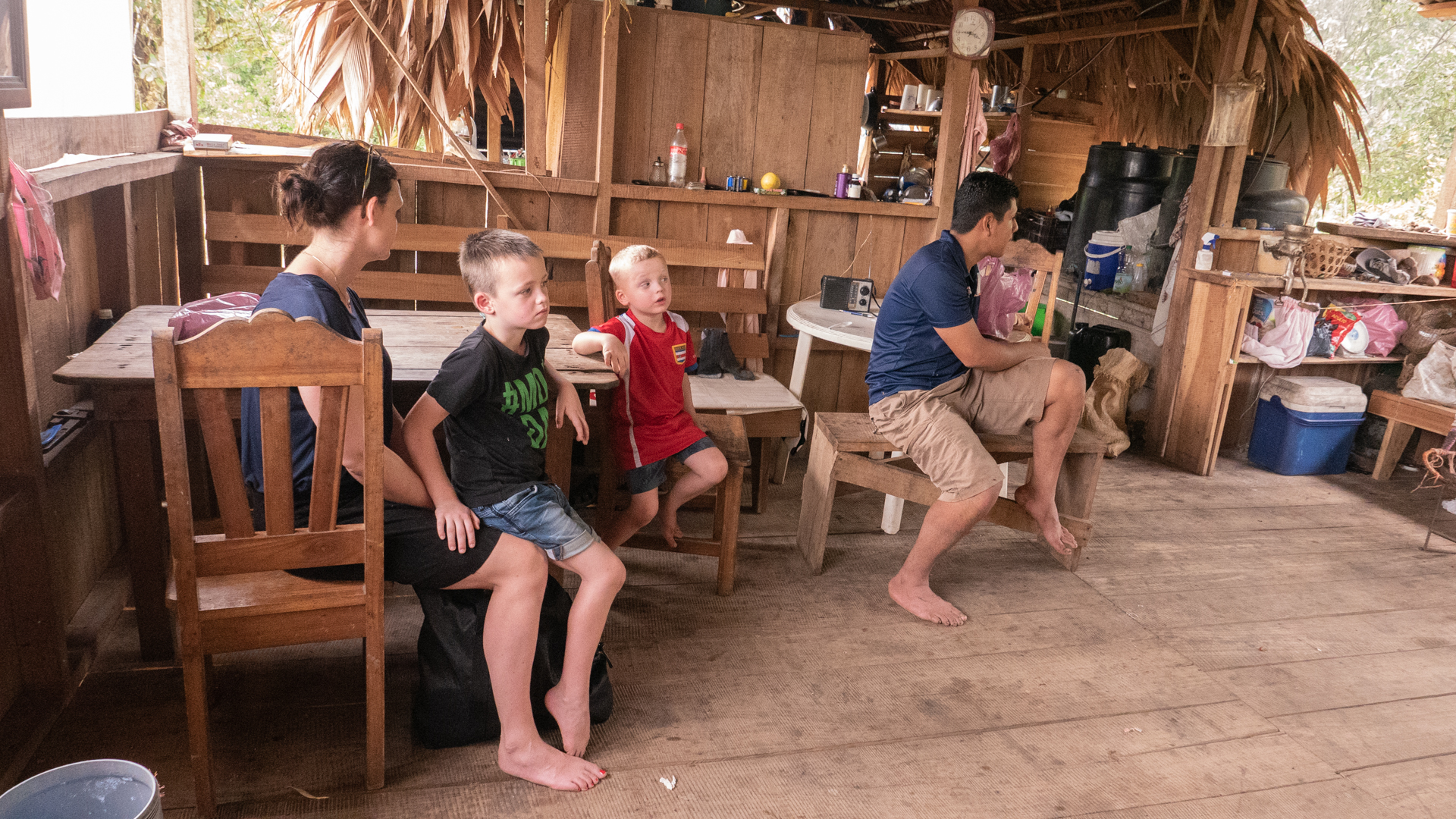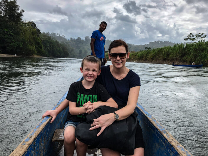 Vi ankom til vores smukke bolig som er et ”community house”, som det lokale fællesskab bruger til at markere og fejre forskellige begivenheder. Huset er bygget af træ og bambus og er virkeligt smukt. Efter et par timers chill-tid fik vi frokost og så gik vi ned til floden, hvor to indianere var kommet med deres båd. De sejlede os et stykke op af floden, hvor vi stod af på den anden side. Floden markerer grænsen mellem Costa Rica og Panama, så uden vi rigtigt opdagede det var vi pludselig i Panama. Viggo var dog ligeglad med om det var Panama eller Costa Rica – han kaldte det for ”indianerøen”. Herfra gik vi op ad en skrænt, og pludselig ankom vi til et plateau, hvor der boede fire indianerfamilier med børn, hunde, høns, kalkuner osv. Vi fik lov at se deres hus og de serverede en eller anden form for frugtjuice/kornjuice med underlige klumper og kerner i, som smagte noget mærkværdigt, men Alex insisterede på, at det var den bedste energibar, man kunne få. Faren i huset lå og chillede i sin hængekøje og lignede ikke en, der havde tænkt sig at rejse sig op de første par timer. På et tidspunkt var det lykkedes nogle af hønsene at hoppe op af trappen til huset. Så kaldte faren dovent på sin datter på ca. 12 år som måtte komme og jage hønsene ned igen – nogle ting er de samme uanset kultur.