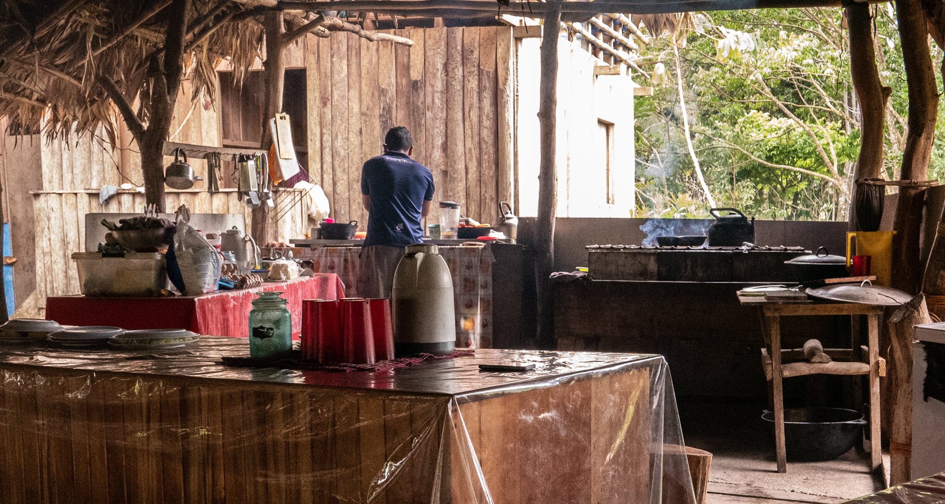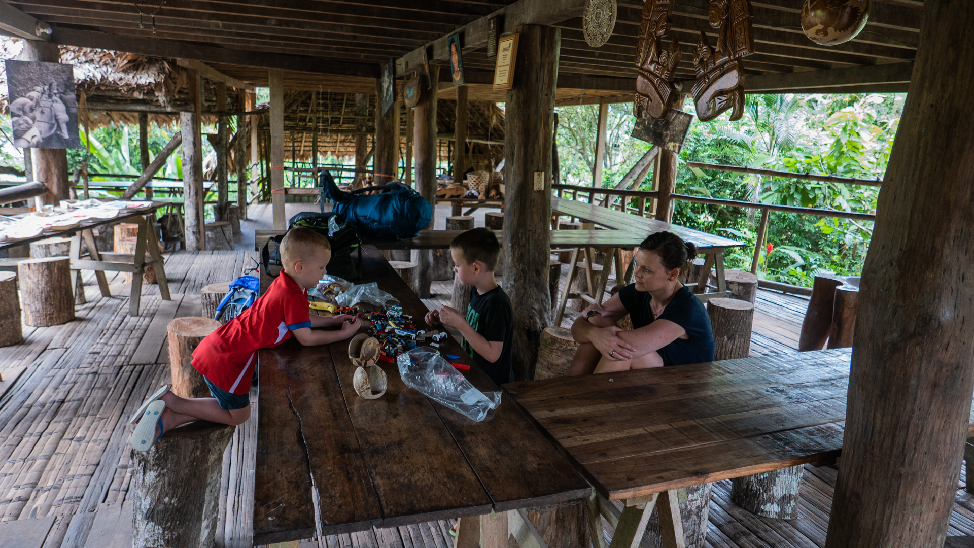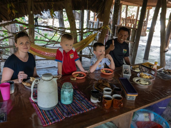 Vi logerede ind på et hostel i et familieværelse, hvor vi delte fællesfaciliteter med nogle andre backpackere. Det er et hyggeligt primitivt lille sted lidt uden for byen hvor brølaber råber og skriger fra kl. 5.30 om morgenen, og hvor man kan høre tukaner i træerne. Det med aberne gør ikke så meget – vi vågner alligevel lidt tidligt.