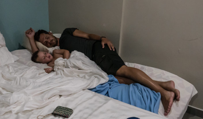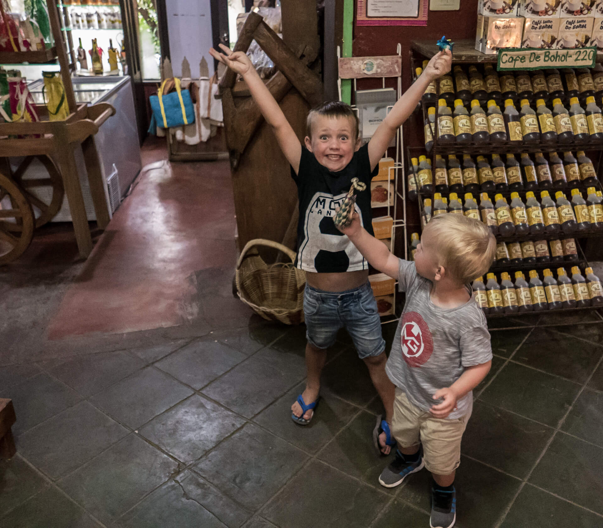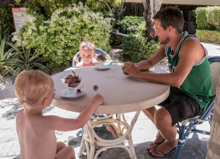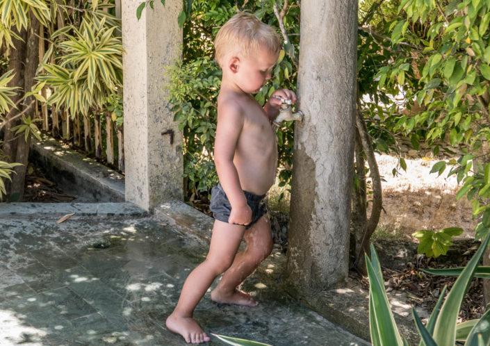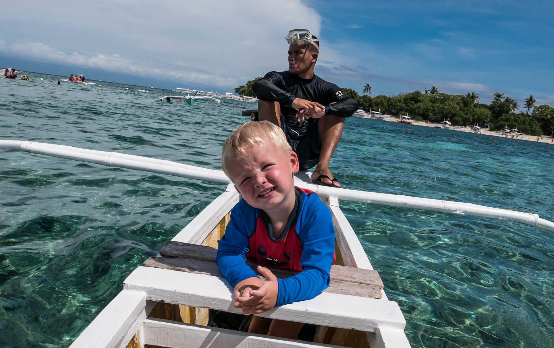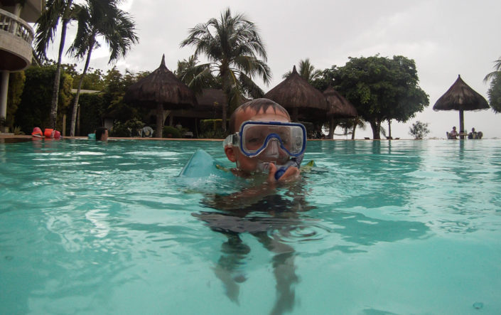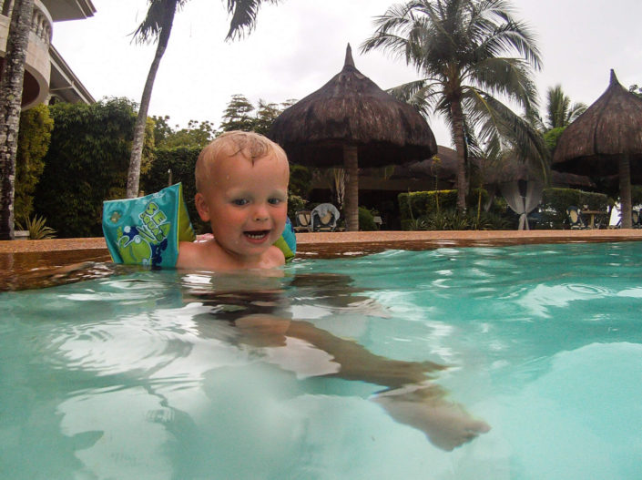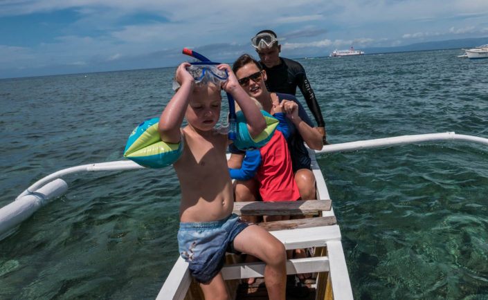 Vi har tænkt på, at det er sådan lidt med Filippinerne, at der ofte er to versioner én ”på-afstand” og én ”tæt-på”. På afstand er de Filippineske strande smukke, med udsigt til de karakteristiske både, som ligger rundt omkring. Kommer man tæt på, oplever man uundgåeligt lavvande, hvor man ser de bunker af skrald, som flyder rundt på havbunden. På samme måde med bådene, som er perfekte at snorkle fra – på afstand ser de smukke og originale ud – når man så kommer afsted går det op for én, at man umuligt kan føre en samtale, mens man sejler, fordi larmen fra motoren er så høj (forhindrer dog ikke Viggo i at sove J). Jonas har lært en af tjenerne lidt at kende, og ved første øjekast ligner han én, der intet mangler. Når man kommer lidt tættere på, viser det sig, at hans liv består af 6 dages arbejdsuger på 12 timer, og den ene dag, han har fri, der må han i skoven for at fælde brænde, da de ikke har en ovn. Han bor med sin kone og tre børn i en meget primitiv bambushytte, og han har stort set aldrig tid til at være sammen med sine børn. Han tjener 300 pesos om dagen – det svarer til 41 kroner – det er en timepris på 3,5 kr.