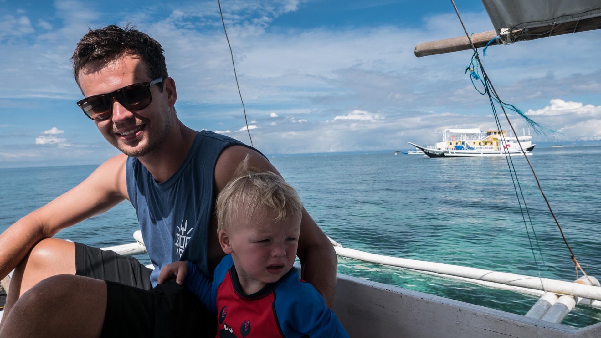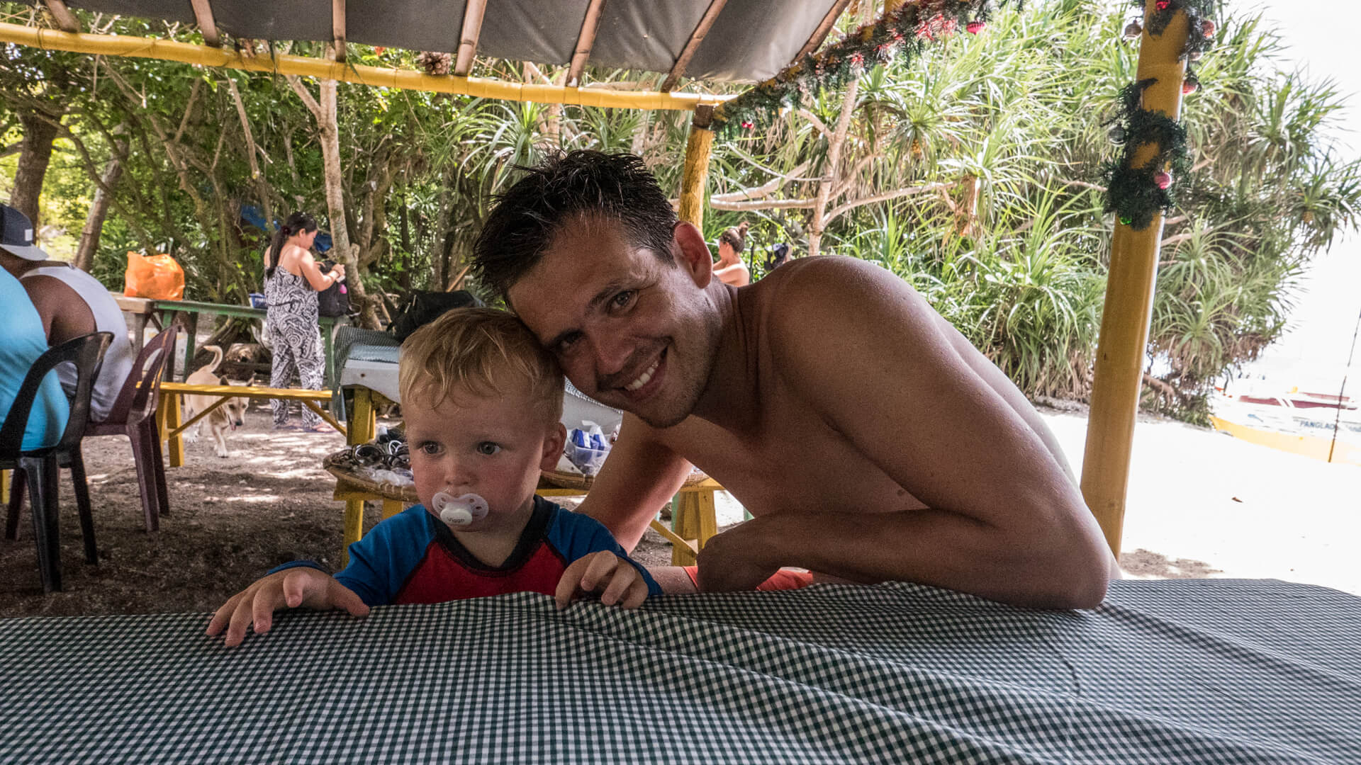 Vi har også været på en sejltur til en nabo-ø for at snorkle. Der så vi alle mulige flotte fisk og koraller. Adam var ikke helt frisk på at få snorkleudstyret på – håber det kommer senere.