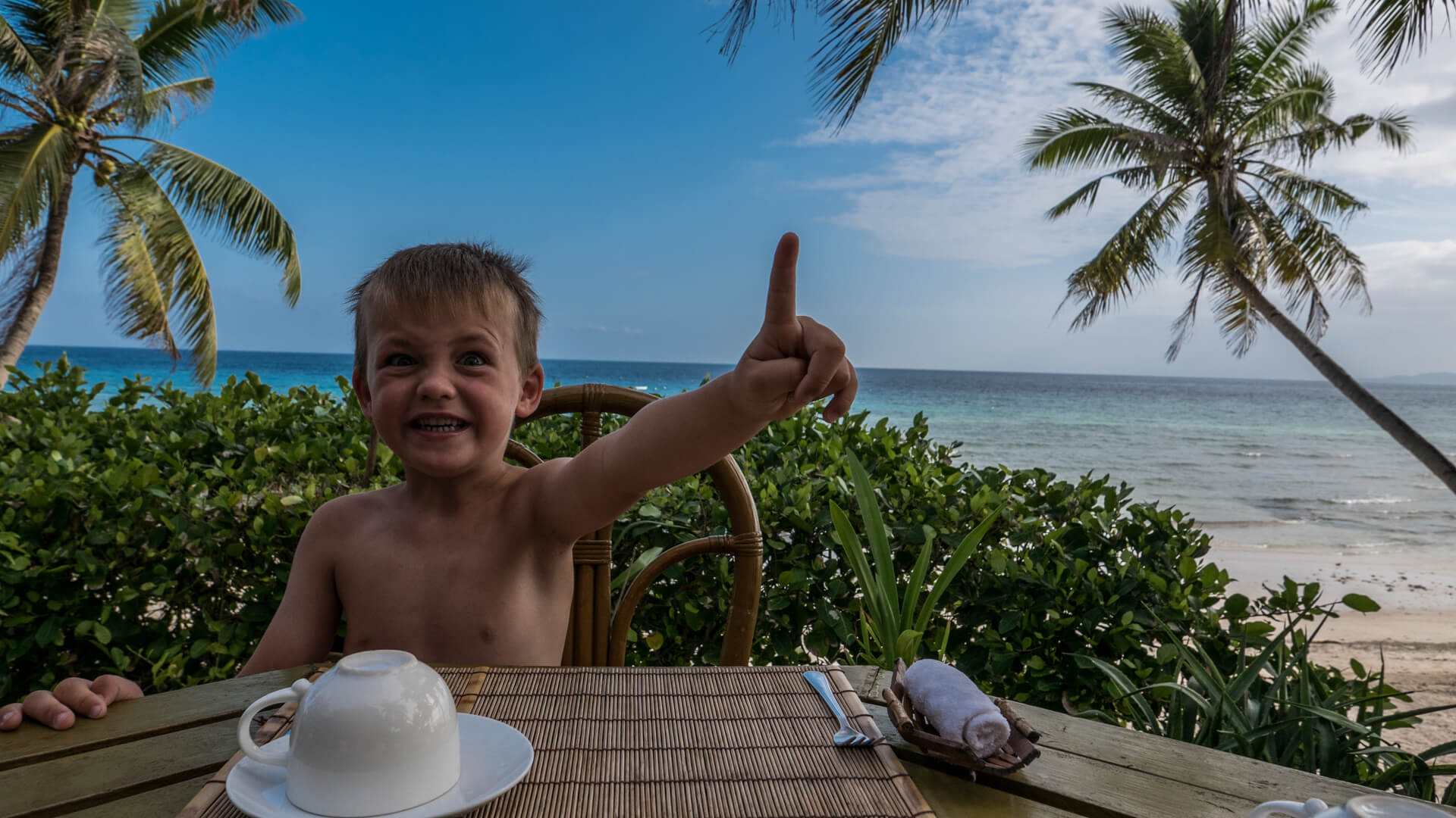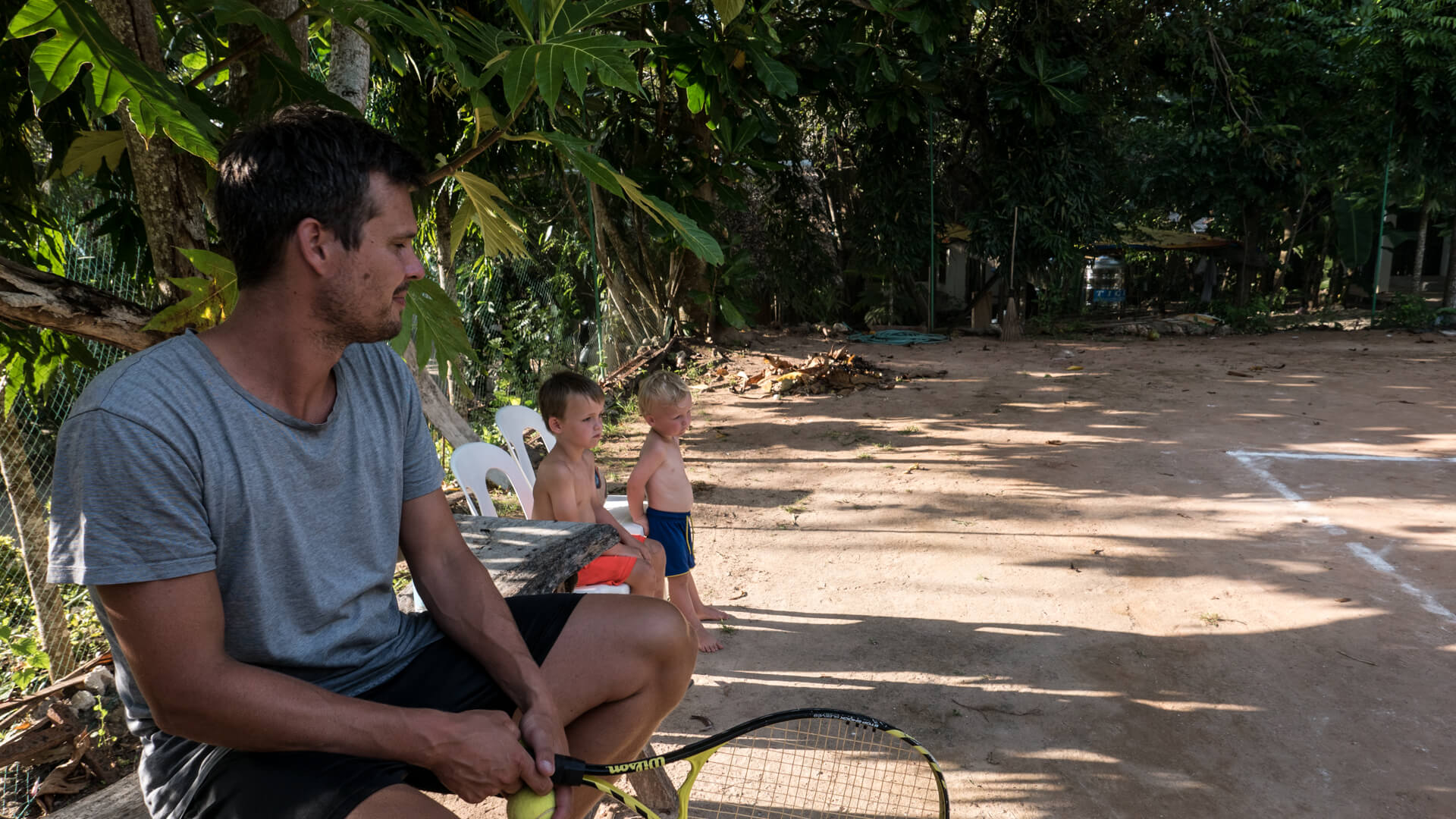 Lige nu handler vores rejse om at indtage denne her verden af langsomhed. Når det går godt, så tager drengene op på tennisbanen og spiller/leger, eller vi tager til stranden og samler muslingeskaller, som vi tegner på, eller vi laver kastekonkurrence med kokosnødder, eller vi leger skib med de små træ-kurve, som der ligger små våde vaskeklude i, som vi kan tørre fingrene i før måltiderne i restauranten. Og når det fungerer, så er det fantastisk, og vi ønsker, at tiden ville stoppe.