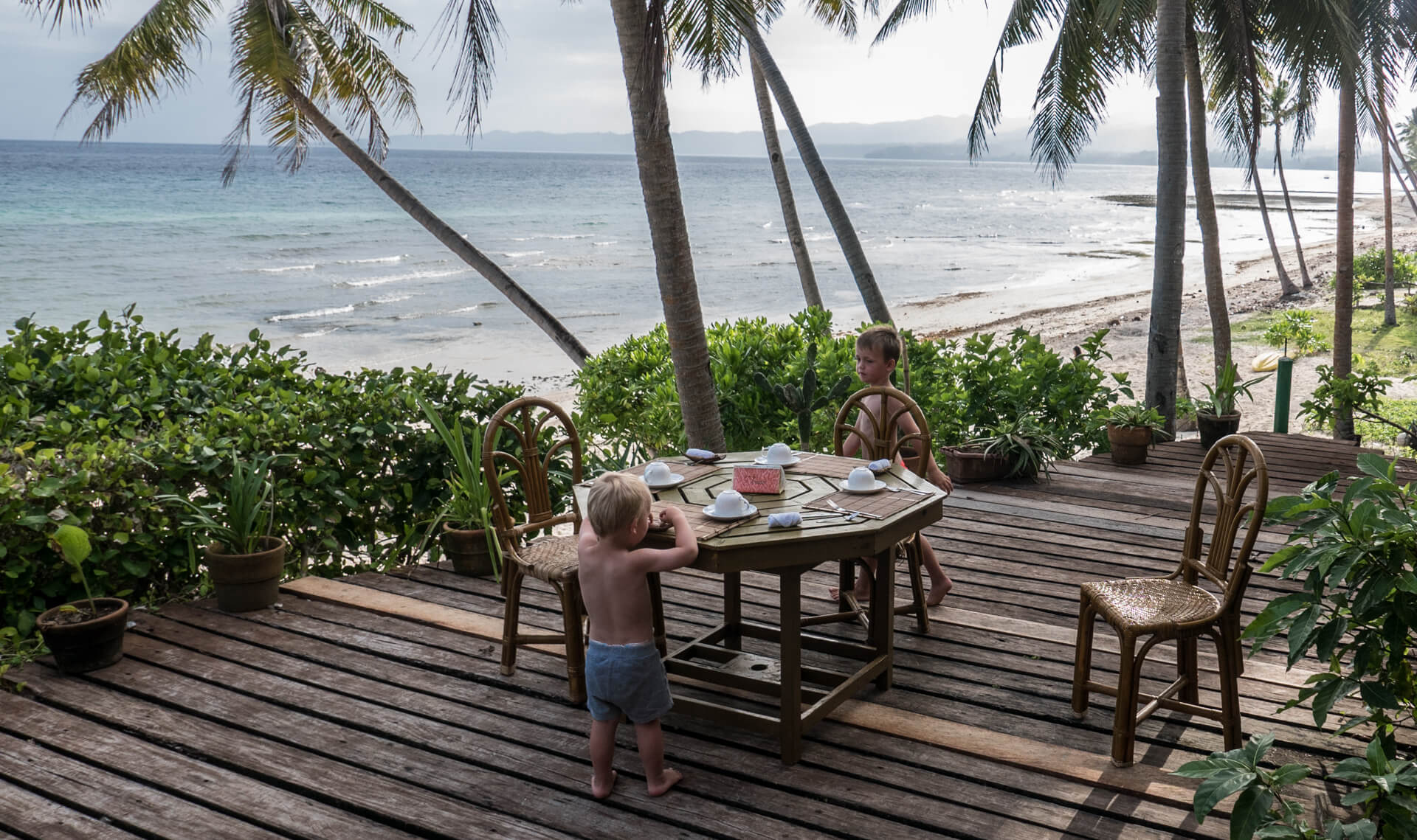 Oplevelsen af klaustrofobi træder frem, hvis drengene ikke rigtigt ved, hvad de skal give sig til. På Linaw var der stort set altid stemning for en tur i poolen, hvis der ikke var andre ting på programmet, men her er der ingen pool, og stranden er ikke så velegnet for børn – allerede efter klokken 11 er bølgerne så høje, at det bliver lidt for vildt for børnene.