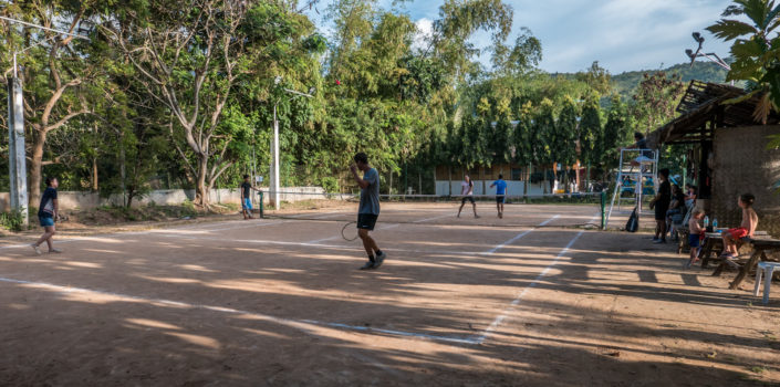 Vi er logeret ind på Villa Marmarine – et originalt hotel, som drives af en japansk familie. Daman, som ejeren hedder er en rigtig hyggelig morfar type. Han har bygget stedet op i original japansk stil – alt er tilpasset mennesker, som er ca. 80% højden af europæere. der er lavt til loftet, stolene har korte ben, og selv toilettet er lavt (minder om de der børnetoiletter, man har i børnehaverne i DK). Vi har vores egen lille bungalow med to etager, så drengene har deres eget værelse ovenpå, hvor der dog ikke er andet end to senge med myggenet henover. Villa Marmarine har fået topanmeldelser på tripadvisor, og her er så charmerende med den dejlige beliggenhed og udsigt ud over strand og palmer. Daman er tennis entusiast (koden til internettet er “welovetennis”), og hver dag kl. 16 står den på tennis for de lokale og for de ansatte. De fleste ansatte er lokale unge, som Daman tager sig af og “uddanner”. Der hersker en udpræget respekt for Daman og hans familie – de ansatte bukker, når de hilser på ham – og man kan godt forstå hvorfor. Modsat den klassiske filippinske arbejdsgiver, bruger Daman en masse krudt på at skabe en humoristisk, afslappet, respektfuld og hjælpsom stemning blandt de ansatte og gæster. Når der spilles tennis skal alle være med – også pigerne, som serverer i restauranten, og så må niveauet justeres herefter. Det er tydeligt, at dem som har det laveste niveau bliver bakket mest op.