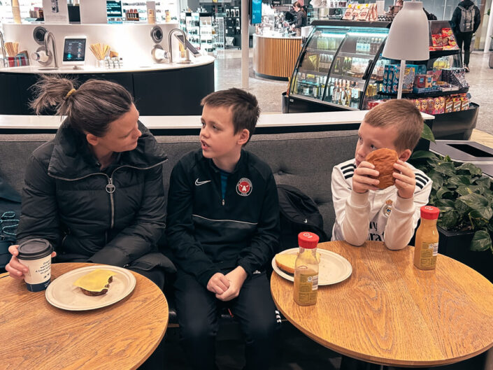 Vi var alle fire lettere overvældede og kom til at stå lidt uheldigt i forhold til at komme med minibussen fra Europe car, der kom efter en halv time. Dette var minibussen, som skulle fragte os ud til udlejningscentralen, hvor vi havde lejet en bil. Vi var alt for mange mennesker til én minibus, og ærlig talt var det ret pinligt at se, hvordan folk kæmpede som gale for at arbejde sig frem og kyle sine kufferter ind i bussen for at komme med. Vi bryggede en selvhøjtidelig fortælling sammen til drengene om, at det er utroligt dårlig stil at kæmpe sig frem på den måde (som om det ikke ligeså godt kunne have været os). Da anden bus kom, og vi heller ikke kom med den, begyndte det at blive for meget for Adam: ”Hvorfor er vi så passive i den her familie?” sagde han, og situationen begyndte at være ret morsom. Vi fortsatte den selvhøjtidelige fortælling om, at vi garanteret ville komme aller forrest i køen, når vi endelig kom frem til udlejningscentralen, og ganske rigtigt – da vi kom frem gik der kun 10 minutter fra Jonas gik ind ad døren til han kom ud igen med en lyksaligt smil på læben. Han fortalte, at vi – idet vi havde booket direkte gennem Europe car (og ikke gennem eksternt bureau) – havde fået en upgrade til lidt af en slæde. Der blev flettet en enkelt kommentar eller to ind om, at det ganske sikkert også var fordi, chaufføren i minibussen havde fortalt, at vi havde været meget tålmodige. Personligt er jeg stadig ikke overbevist om, at den kæmpe slæde ikke blot var den, Jonas havde bestilt hjemme fra Danmark.