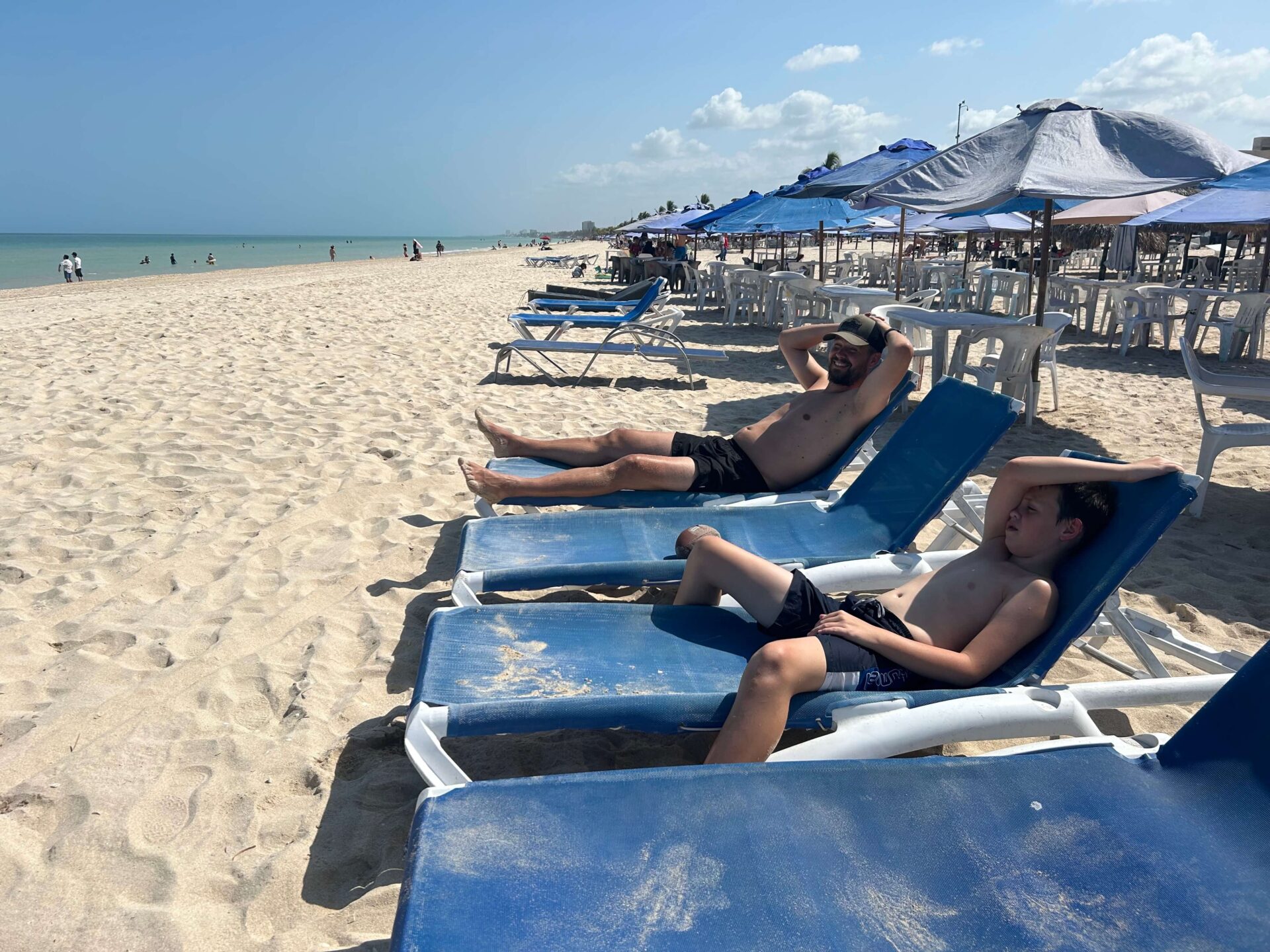Vi havde booket os ind i en lejlighed i et boligkompleks med fælles pool. Atter havde vi stort set poolen for os selv. Februar er et godt tidspunkt at rejse på i Mexico. Vi tog på stranden i Progreso nord for Merida. Progreso er en lille by der ligger 20 min nord for Merida. Vi forventede nok, at beliggenheden og den skønne strand ville betyde, at der var ret lækkert. Men byen var ret faldefærdig. Til gengæld var stranden skøn og vi fandt et hyggeligt sted ved en strand klub, hvor vi snakkede lidt med nogle amerikanere.