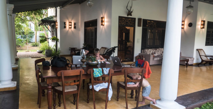 Før det boede vi på et – på papiret (eller på booking.com) helt fabelagtigt sted. Det var en kæmpe villa med flot arkitektur med store værelser, højt til loftet, eget køkken, kæmpe badeværelse, kæmpe terrasse (til stort set ingen penge). Det var indrettet med flotte dyre møbler og udstyr – ex. en kæmpe gas-ovn og alt i hifi – som vi ikke har set noget andet sted i Sri Lanka. Virkelig luksuriøst. Det man ikke kunne se på booking.com (ej heller i anmeldelserne) er, at det tusse gamle tog kører lige i baghaven, og hver gang det kommer, tuder hornet horribelt højt – fordi der er en jernbaneovergang næsten lige ved siden af villaen. Det var helt crazy højt, og Viggo gik nærmest i panik, hver gang det kom susende forbi (det første tog kom heldigvis først kl. 6.30 om morgenen 😉 ). Ejerne var 2 unge mænd (altså på vores alder :)) – som sammen med deres ansatte sådan lidt kom og gik i løbet af dagene, hvilket var lidt mærkeligt. Ex. kom de for at fylde køleskabet op med drikkevarer, eller kom for at feje lidt, eller for at slukke noget lys. Det var sådan at pludselig – førend vi vidste af det, så stod der en ung mørk gut i køkkenet og var i gang med et eller andet. Det gav sådan en underlig oplevelse af ikke at have huset for os selv – og vi havde af og til også selskab af naboens gigantiske rottweiler, som kom løbende, logrende med halen til min store angst! På en eller anden måde var der noget suspekt ved stedet, som gjorde at det trods luksus var rart at tage derfra. Og nu skrev jeg med vilje det med en ”ung mørk gut”, for måske er det bare os, som til trods for, at vi i 3½ måned har været nødt til at stole på alle mulige tilfældige mennesker, vi har mødt, ikke kan sige os fri for at være mistroiske i forhold til bestemte typer mennesker. Det spørgsmål, vi stiller os selv er nok, hvorvidt det er en form for racisme, som vi burde gøre op med, eller om det er god sund fornuft og dømmekraft. Uanset hvad, så er noget af det, vi ikke kommer til at savne, afhængigheden af at kommunikere med mennesker, som er ret dårlige til engelsk. Vi er blevet ret gode (især Jonas) til at kommunikere direkte – nærmest kommanderende med chauffører, tjenere, receptionister osv. – og vi har en samtale kørende om, hvorvidt det er passende. Jonas’ argument er, at det er den måde, de bedst forstår beskeder på (og som de egentlig helst vil have beskeder). Mit argument er, at man jo godt kan være højflig og smilende, når man beder om noget. Faktum er, at der er større chance for, at vi får det som vi gerne vil have det, hvis det er Jonas, som kommunikerer. Så kan vi jo tænke lidt over det.