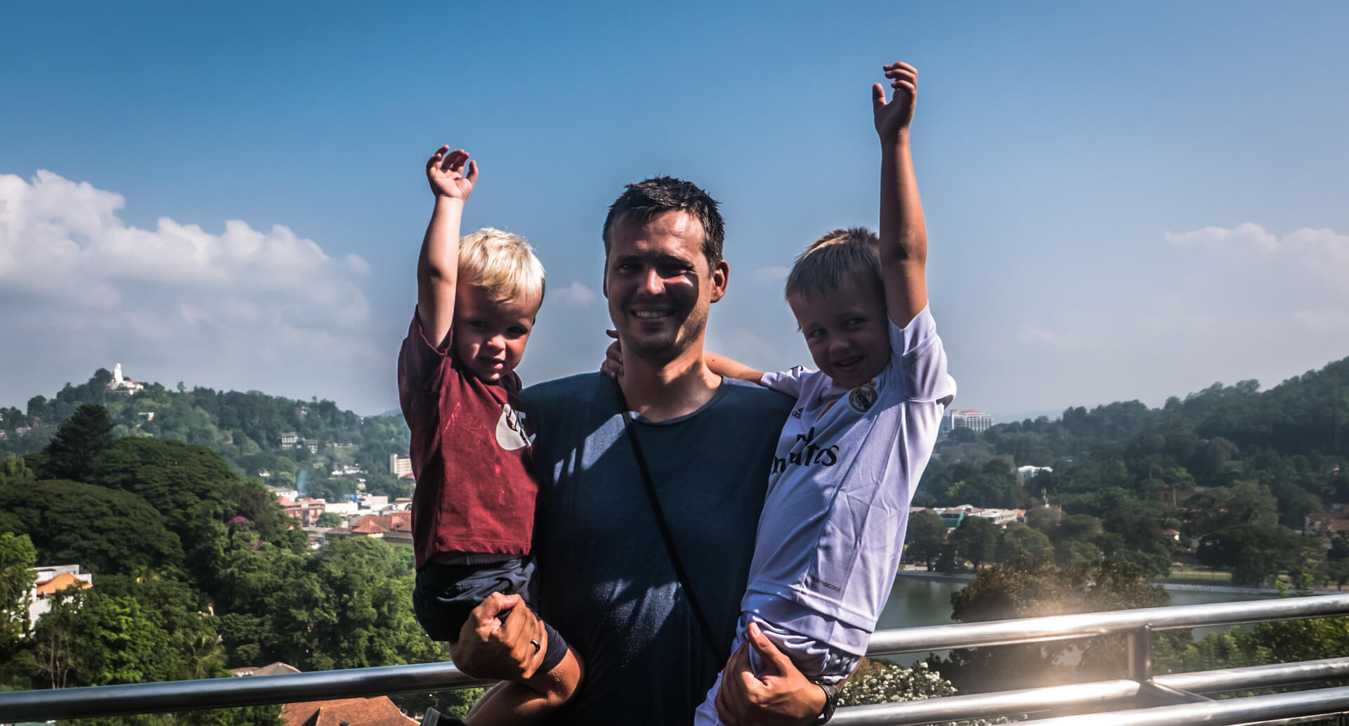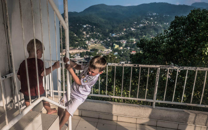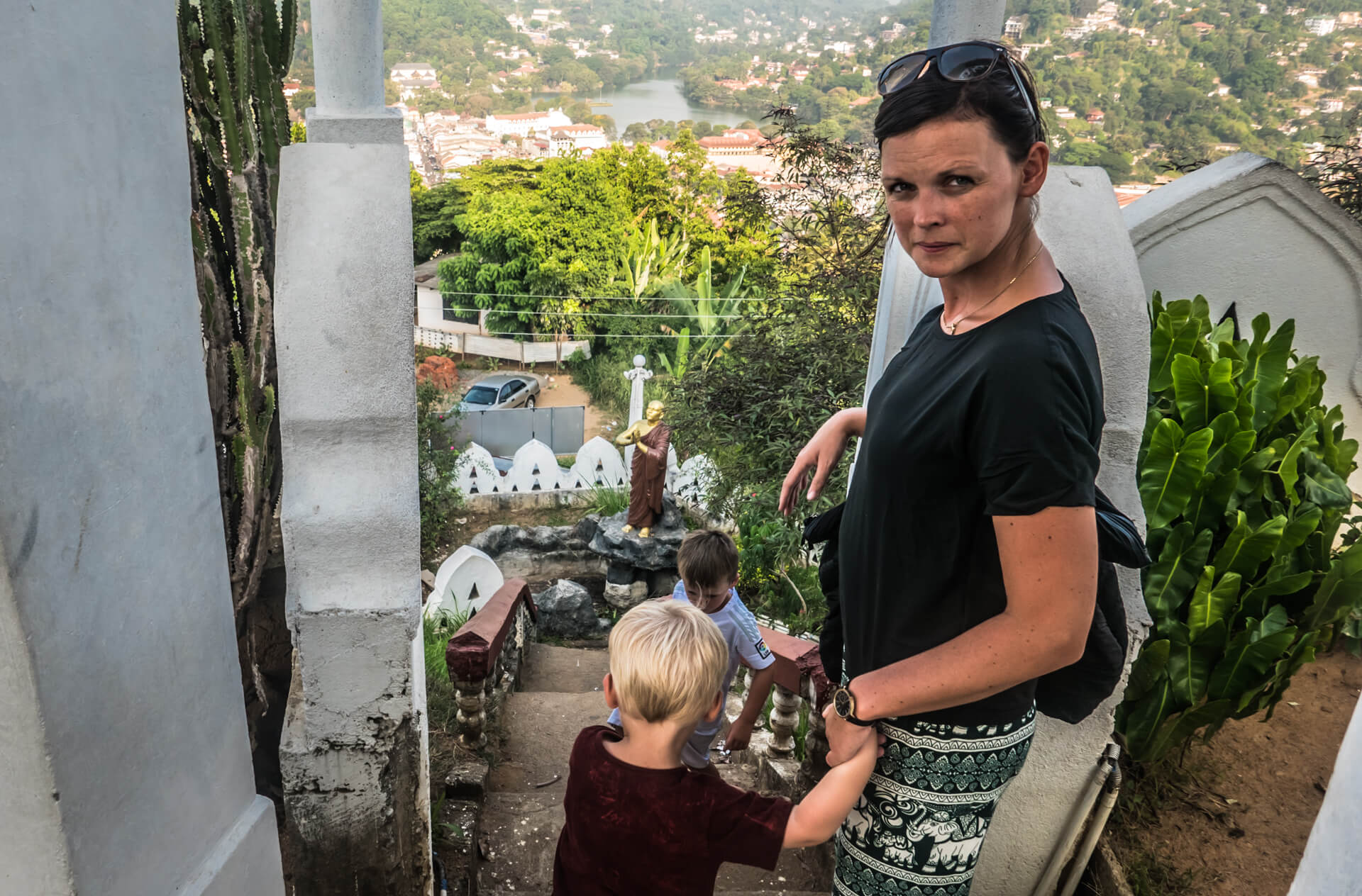 Vi kørte i stedet godt 100 km mod nord-øst til Kandy, som er en religiøs højborg med vigtige buddhistiske templer. Turen tog godt 3 timer, og var lidt af en oplevelse. Vejene er mange steder håbløst smalle, og alle kører som en brækket arm, og laver overhalinger, som man ALDRIG ville se i Danmark. Sjovt nok var det ikke utrygt, for chaufføren var fuldstændig rolig, selvom alt hvad der foregik omkring ham var virkelig hektisk. På turen mod nord oplevede vi Sri Lanka vågne og stå op. Langs vejen stod der skolebørn i fine uniformer og ventede på skolebussen, og folk var på vej på arbejde. Vores egne børn vågnede også op i taxaen, og vi kunne så fortælle dem, at vi var kommet til Sri Lanka. Lige dér hvor vi selv kun havde sovet 2 ½ time, så var det så dejligt, at børnene har vænnet sig til at være på farten. Sovende kom de med ind i flyveren, ud igen, ind i en bus, ud igen, ind terminalen, gennem immigration, hente bagage, forhandle priser om taxa med nogle krejlere, og så ind i taxaen, hvor de endelig kunne sove uforstyrret videre.