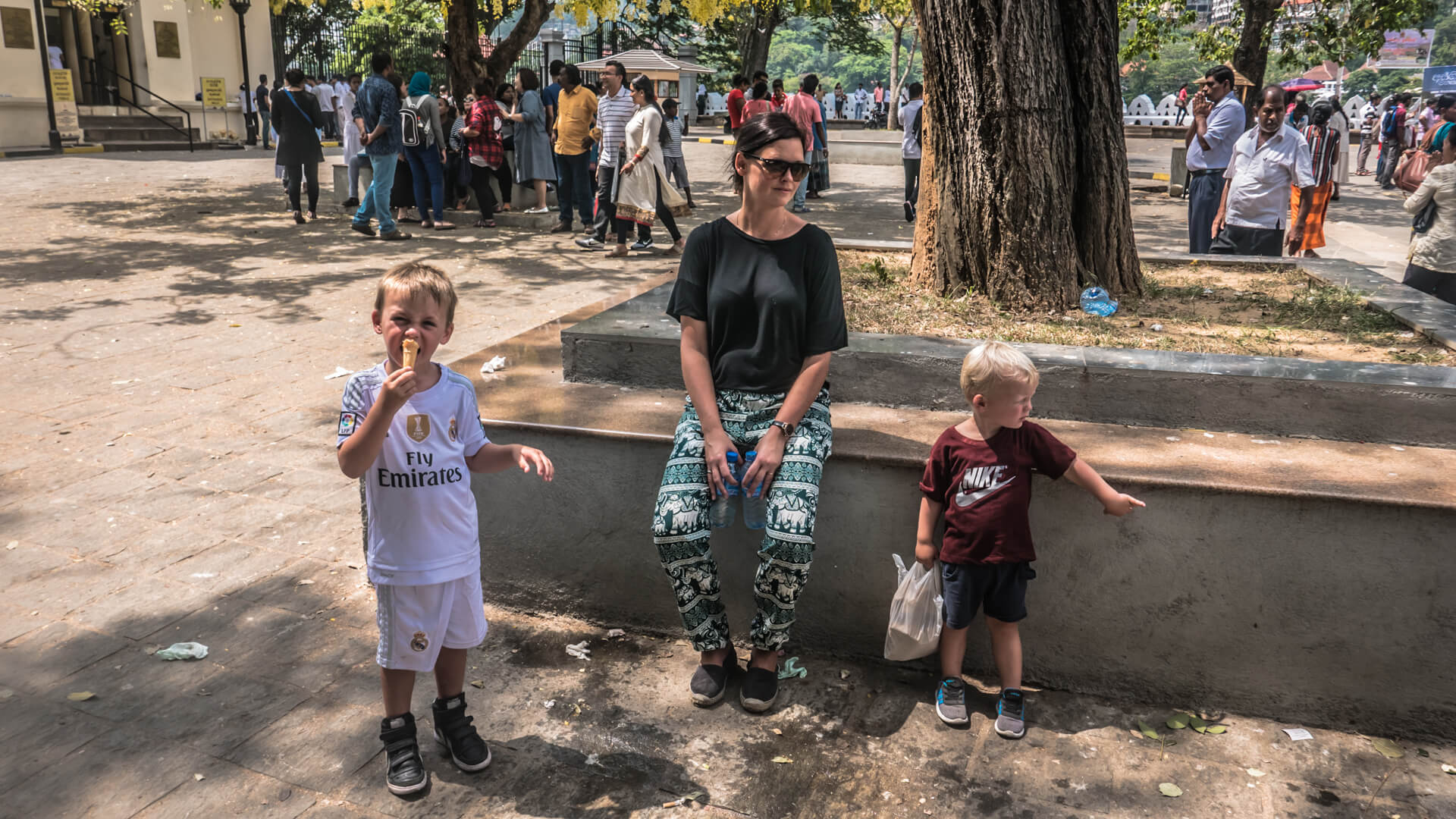 Så er vi kommet til Sri Lanka, og her er skønt med nye indtryk. Det hele startede ellers lidt ærgerligt med tekniske problemer med flyveren, så vi endte med at flyve fra Bangkok kl. 3 om natten i stedet for kl. 22.30 som det ellers var planen. Vi fik ikke noget at vide om, hvad der foregik, så kl. 23 ”puttede” vi børnene på nogle bænke i lufthavnen. Vi landede så i Colombo kl. 6, og besluttede os for at droppe det hotel, som vi så alligevel snart ville skulle checke ud fra.